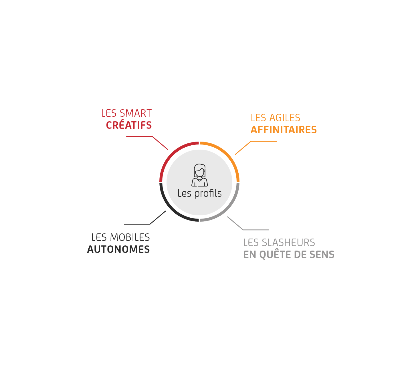- Les « agiles affinitaires » : les trentenaires et pré-quarantenaires hyper adaptés, flexibles, souvent très nomades car ils gèrent des équipes éclatées dans des villes différentes. Leur productivité est orientée performance collective et repose sur un management de proximité où le manageur travaille de façon collaborative au sein de son équipe et à ses côtes.